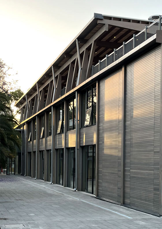 La estructura de madera masiva permite almacenar aproximadamente 265 toneladas de CO₂, contribuyendo a reducir la huella de carbono del edificio.