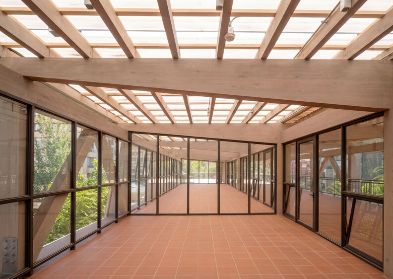 La estructura de madera masiva permite almacenar aproximadamente 265 toneladas de CO₂, contribuyendo a reducir la huella de carbono del edificio.