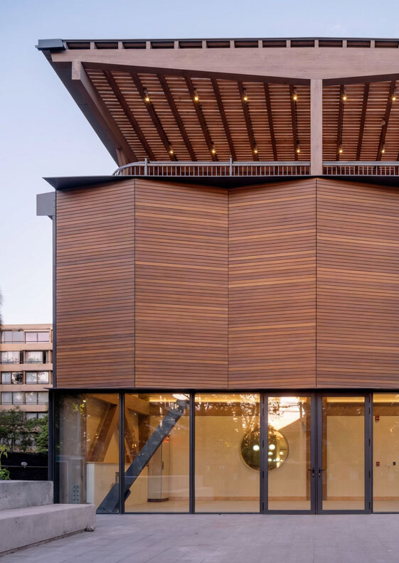 El proyecto incorpora una estructura de madera masiva compuesta por pilares y vigas de madera laminada (Glulam) y losas de madera contralaminada (CLT). Con tres niveles y una terraza superior, el edificio alcanza cerca de 1.400 m² construidos y se posiciona entre las primeras edificaciones institucionales en altura en Chile desarrolladas con CLT.