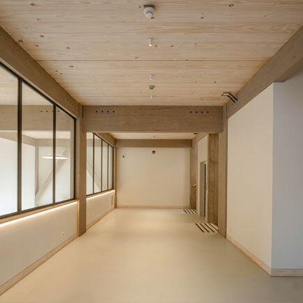 El edificio combina una base de hormigón con dos niveles superiores construidos en madera masiva. Sobre esta base se levantan pilares y vigas de Glulam que soportan losas de CLT expuestas, permitiendo una estructura eficiente y espacios interiores cálidos.