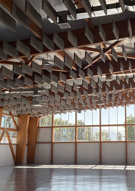 The project is resolved through a structural system of glued laminated timber (glulam) frames repeated along the building’s transverse axes, creating a modular and orderly structural layout.